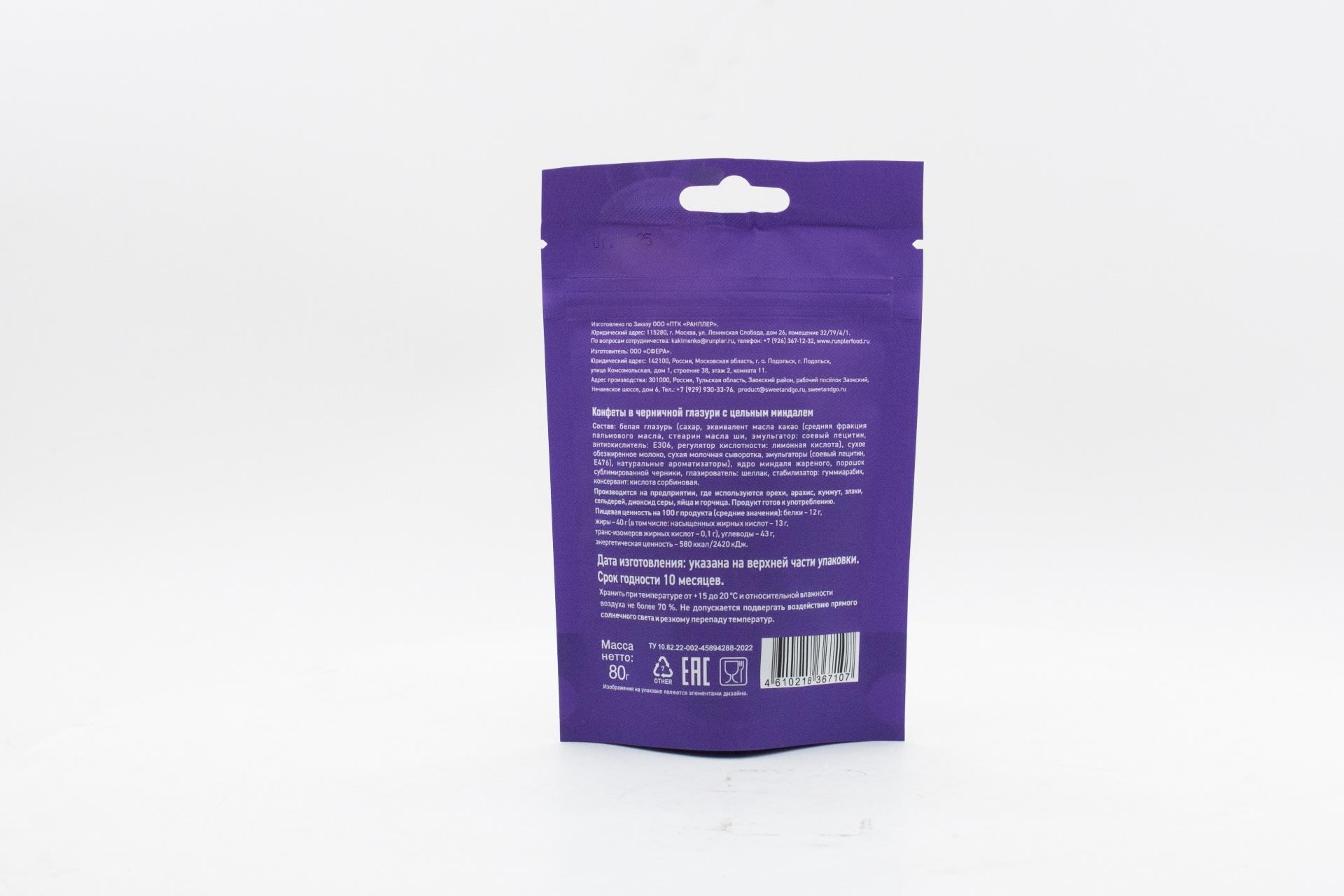 Конфеты Sweet&Go в черничной глазури с цельным миндалем (Россия) 80г121,28 руб. за штуку (в упак. 15 шт.) |